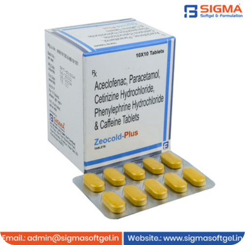 ZEOCOLD-PLUS TAB ZEOCOLD-PLUS TAB Aceclofenac 100mg + Paracetamol 325mg + Cetirizine Hydrochloride 10mg + Phenylephrine Hydrochloride 5mg + Caffeine 25mg Anticold, Tablets 750.00